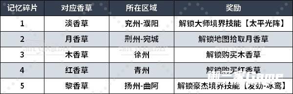 第一个记忆碎片位于兖州的濮阳附近,拾取淡香草并交给元化可以解锁大师境界技能【太平光阵】。