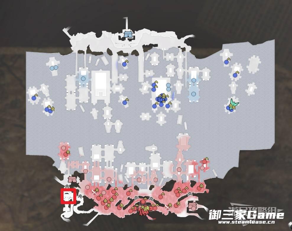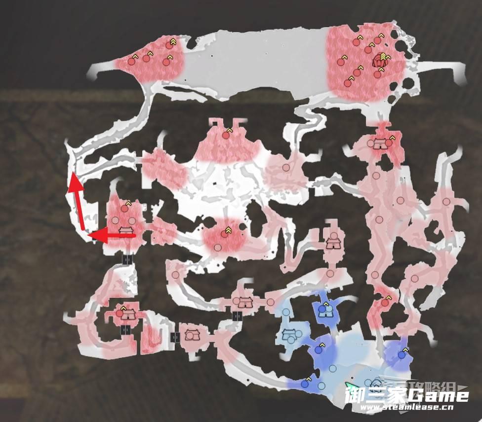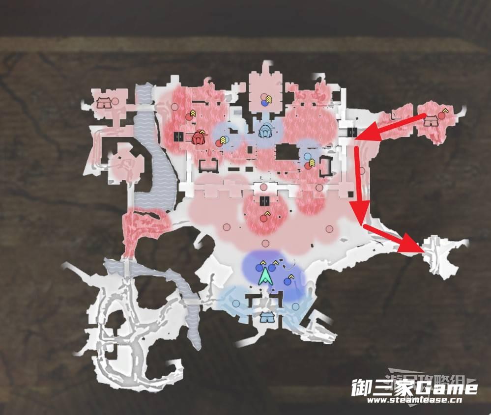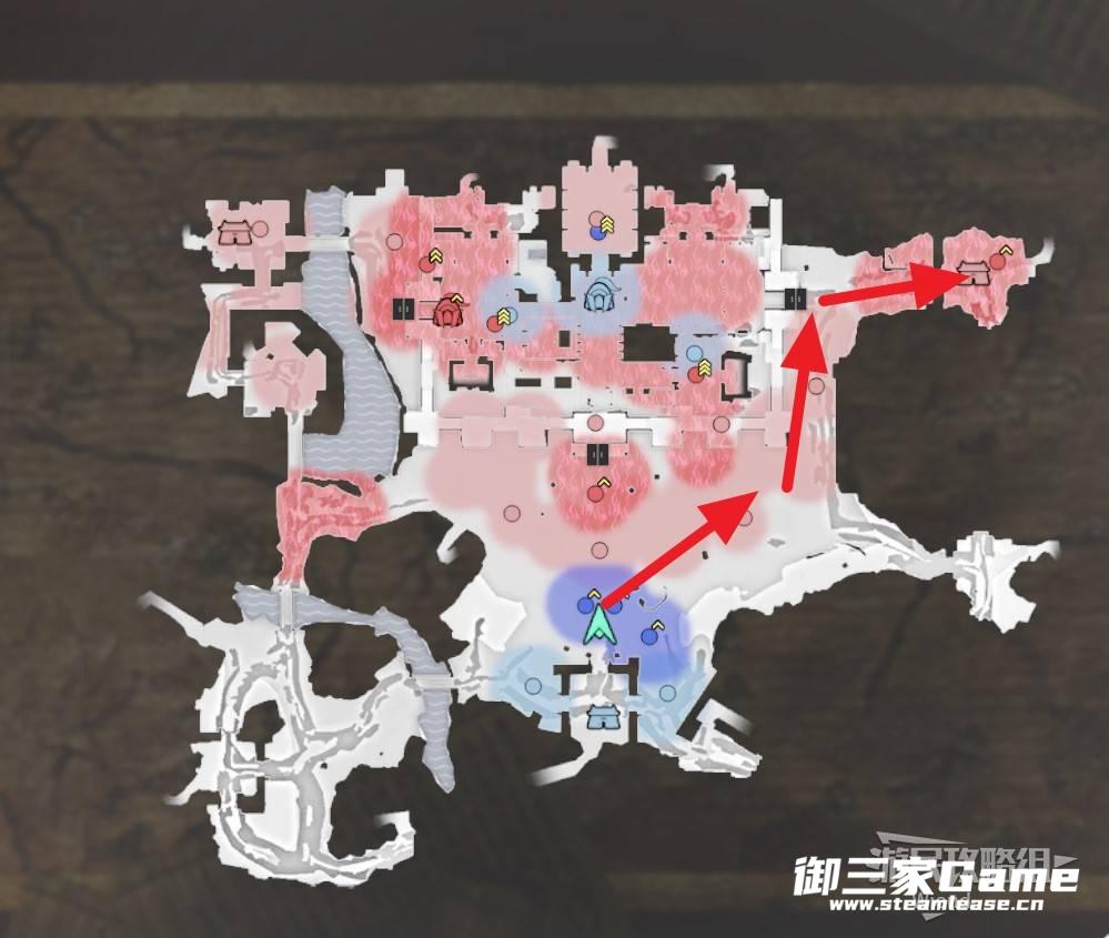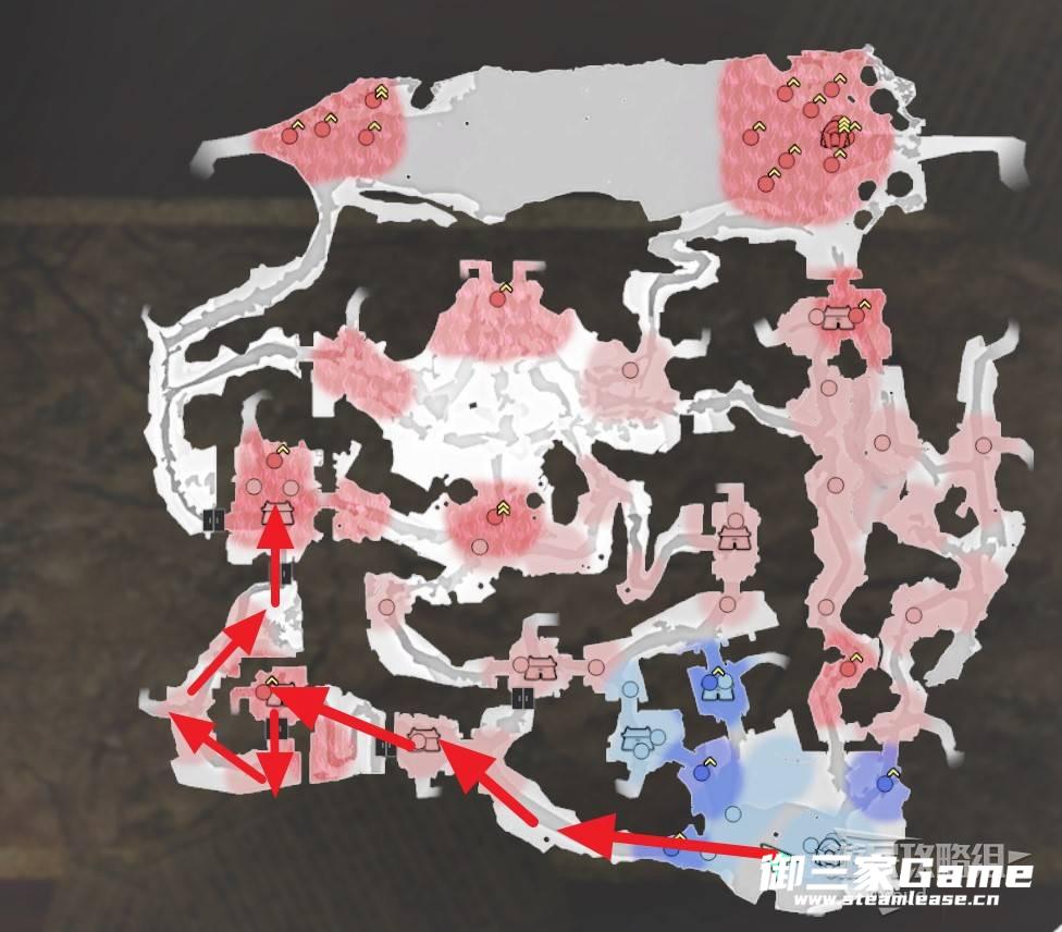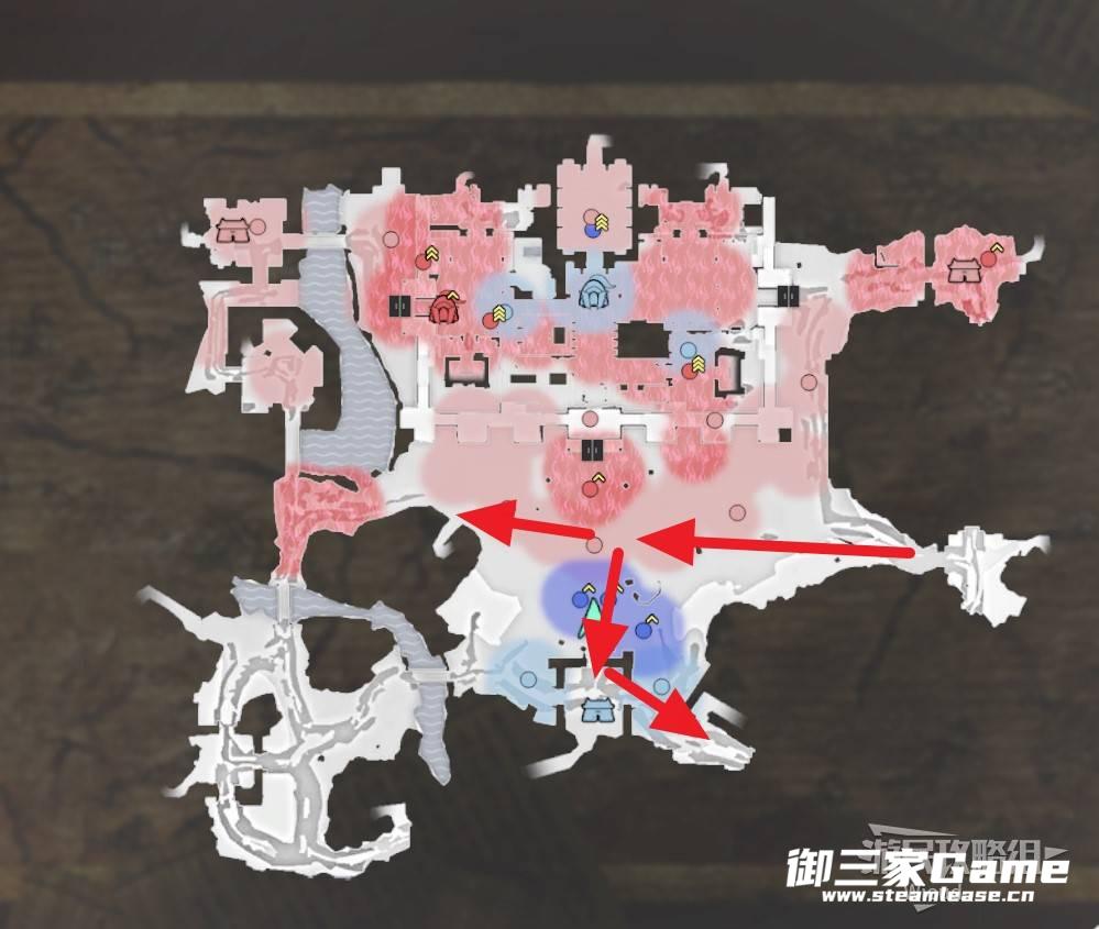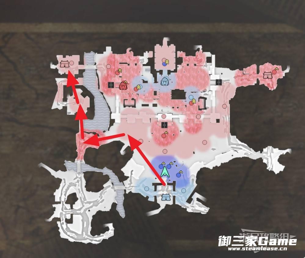 此战开启后我们直接沿着下图所示路线从左边移动到箭头停止处的据点内。