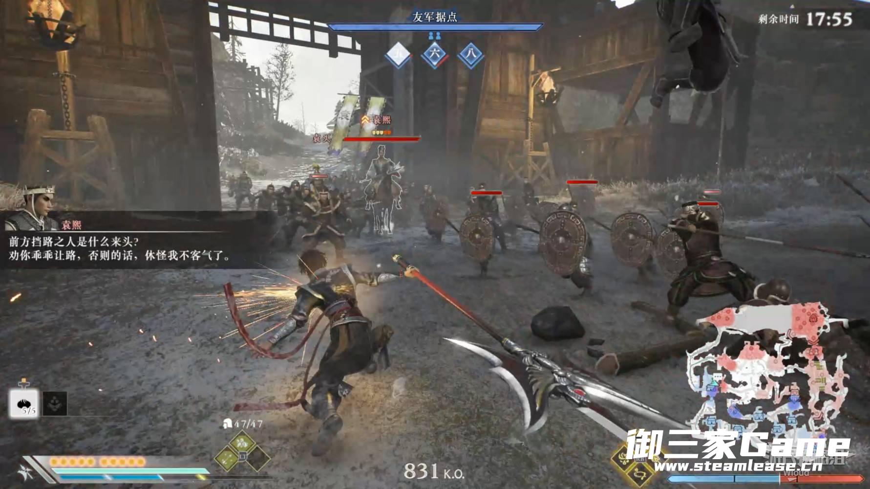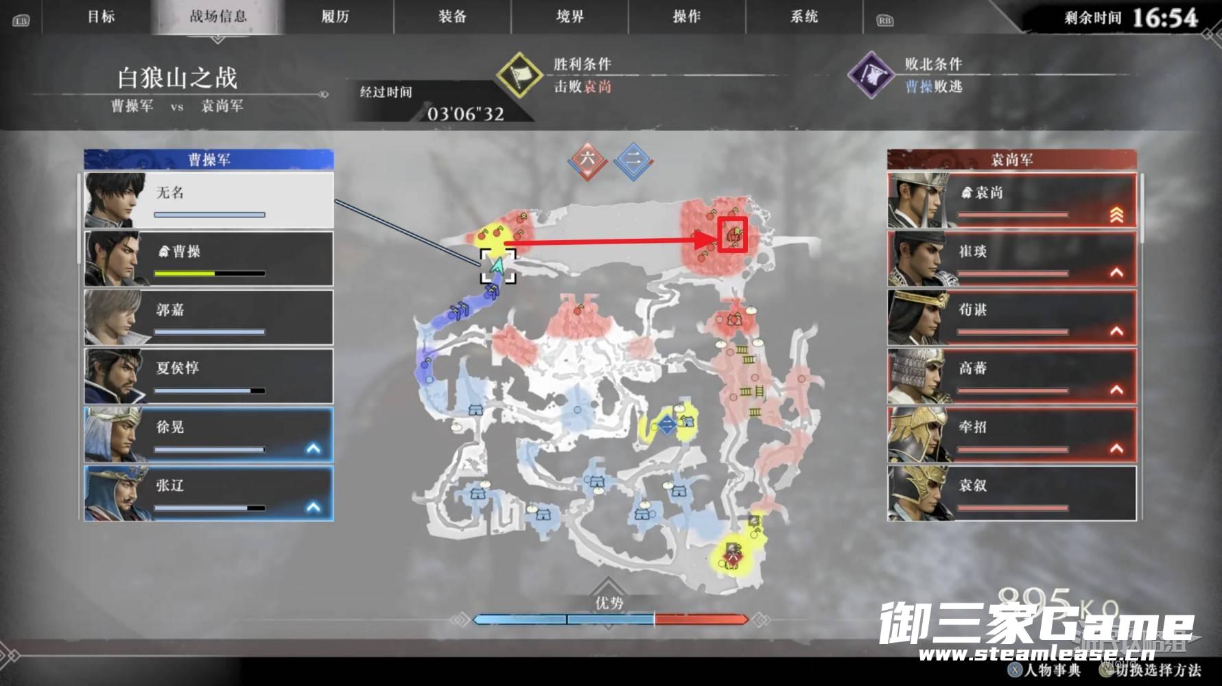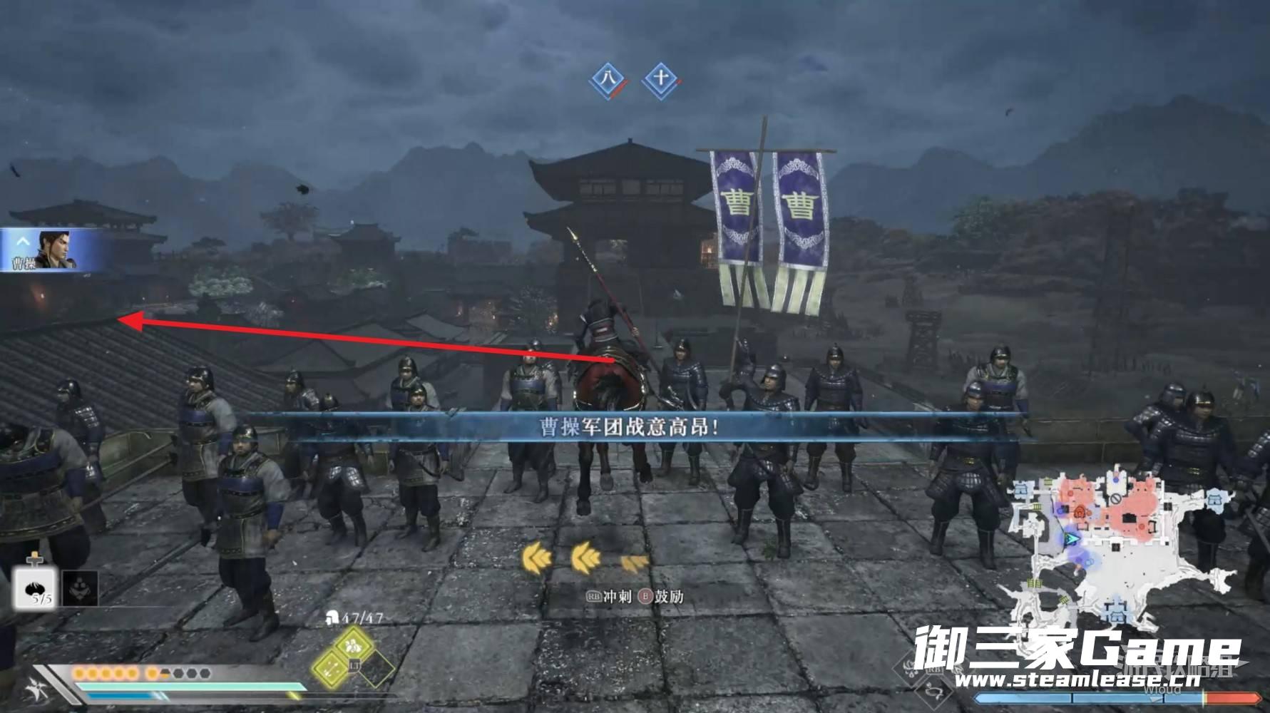 开局先往地图右上角的据点移动,此据点的敌人到达时间会直接向曹操射箭,这里如果在时间到达之前将据点占领将直接跳过这一步骤。