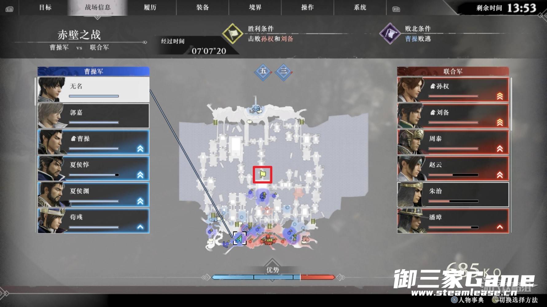 此战开局会将我们刷在地图右侧,先上岸击败周围的敌军,注意左边武将们说的话。