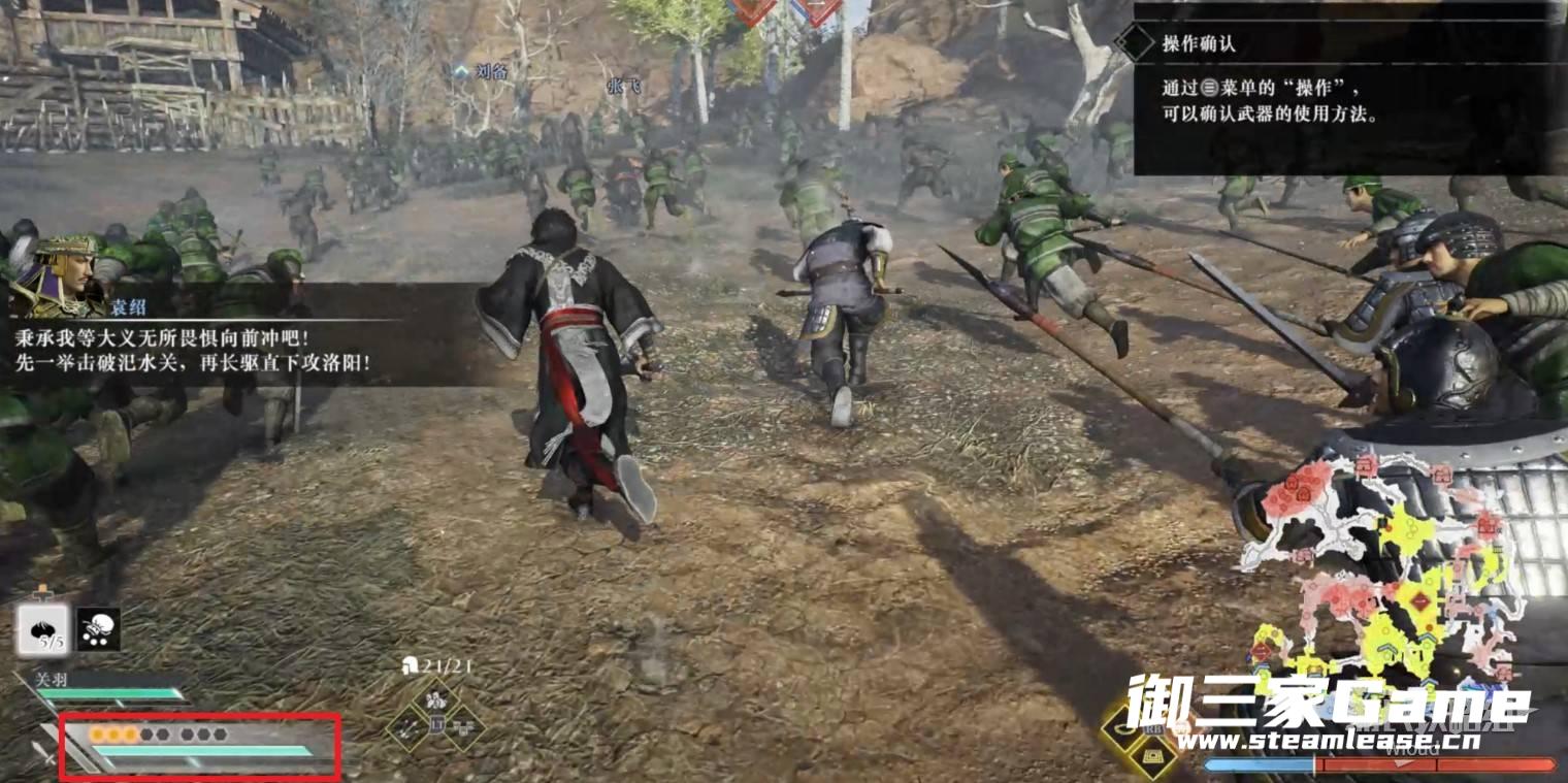 无双乱舞是伤害非常高的大范围攻击,血条下面的蓝条便是无双量表,攻击敌人可以累计无双量表。