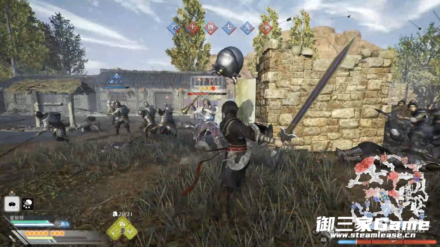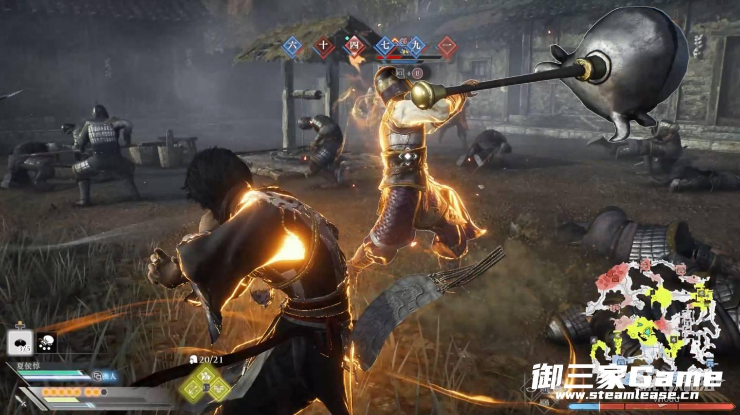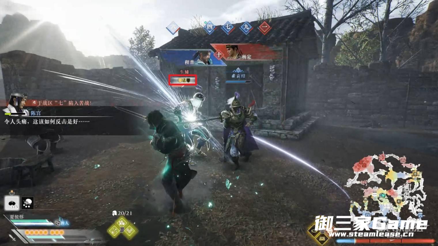 敌人的武将血条上会有盾牌样式的外功量表,类似于其他游戏里的韧性槽,通过攻击可以削减敌人的外功量表。