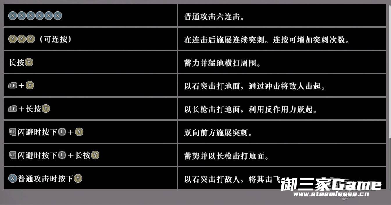 重攻击:最多可以攻击4次,前2下舞动长枪进行单次攻击,第3下对角色前方进行大范围戳枪,最后蓄力向前突刺。