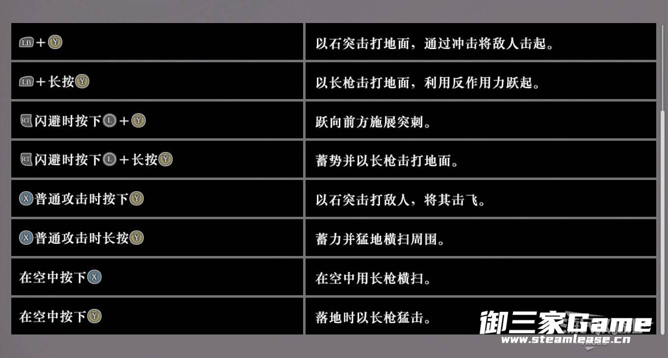 跳跃重击:在空中转体后挥动长枪向下砸去。