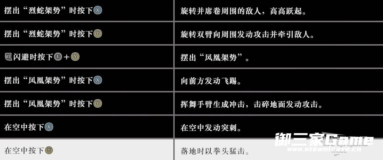 凤凰架势:闪避中同时按下方向键与重击键触发凤凰架势。