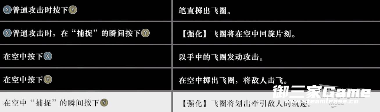 普通攻击时收回飞圈并按下重攻击:向目标扔出2个飞圈并造成持续伤害。
