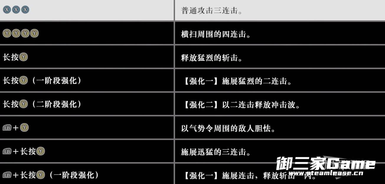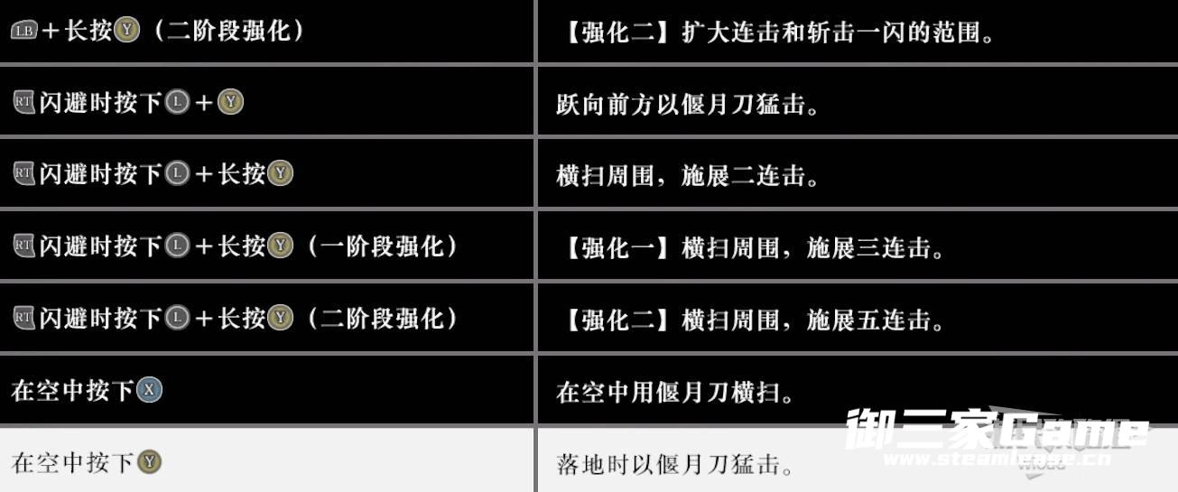 连续闪避时按下移动键+蓄力重击(强化一):原有连招基础上额外增加一次横扫并提升威力与范围。