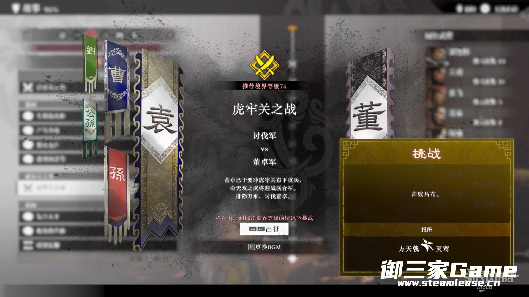 来到第二章找到【虎牢关之战】关卡,此处右下角可以看到新的挑战,击败吕布即可获得方天戟【灭鸾】,也就是本作最强的方天戟。