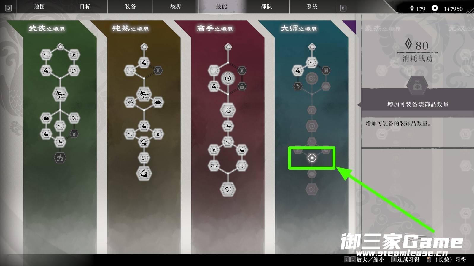 提升境界并解锁【大师之境界】后,用战功在大师之境界的技能树中解锁技能【增加可装备装饰品数量】(需要解锁该技能树的前置技能),即可解锁第二个装饰品栏位。
