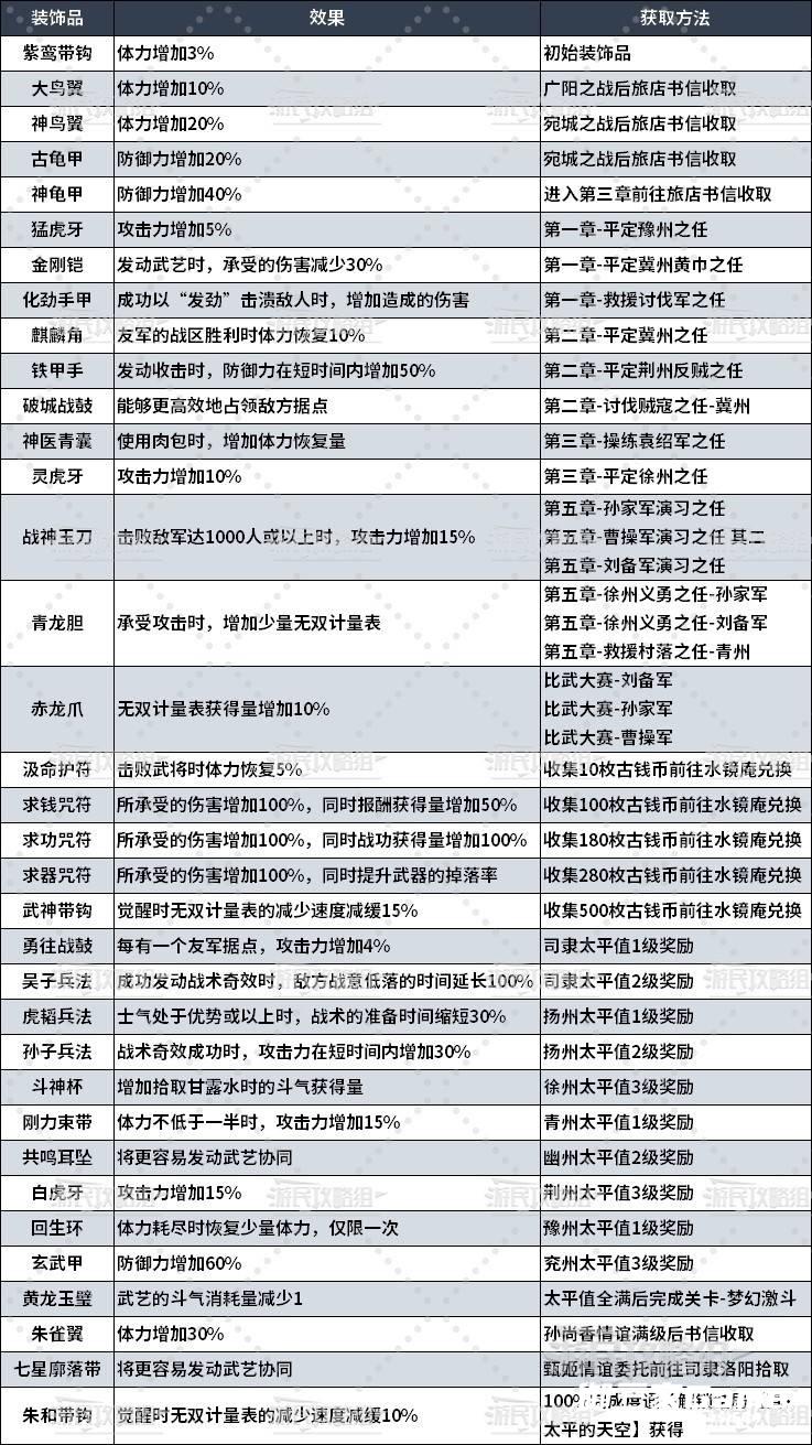 《真三国无双起源》中的装饰品是一种装备,携带后可以使各项能力得到提升,许多小伙伴可能还不太清楚装饰品该怎么获得,下面就为大家带来《真三国无双起源》全装饰品效果及获取方法,希望对大家有所帮助。