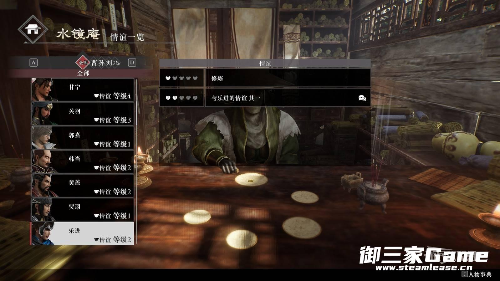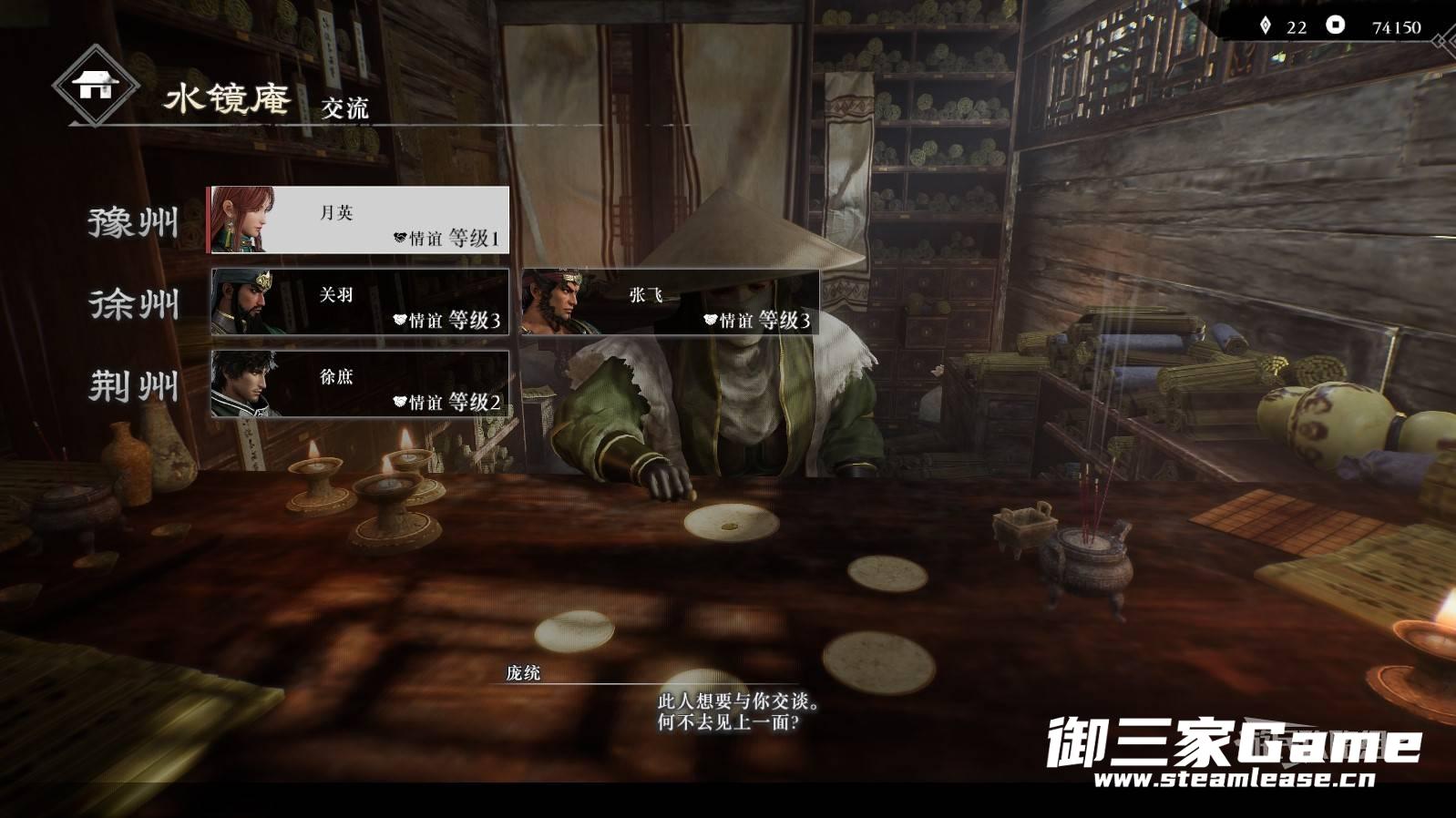 在水镜庵能够兑换古钱币、查看当前与各武将的情谊,并且查看当前可以交流的武将及位置。