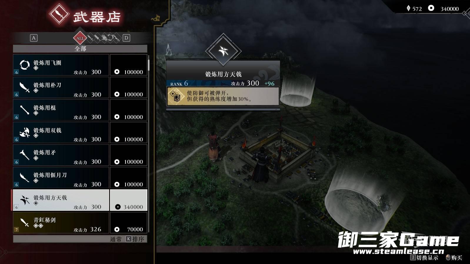 通关后读取通关存档,可从大世界的任意城镇-武器店购买【方天戟】来解锁此类武器,同时解锁该武器的熟练度、招式和武艺(或者通过在关卡中击败吕布解锁)。