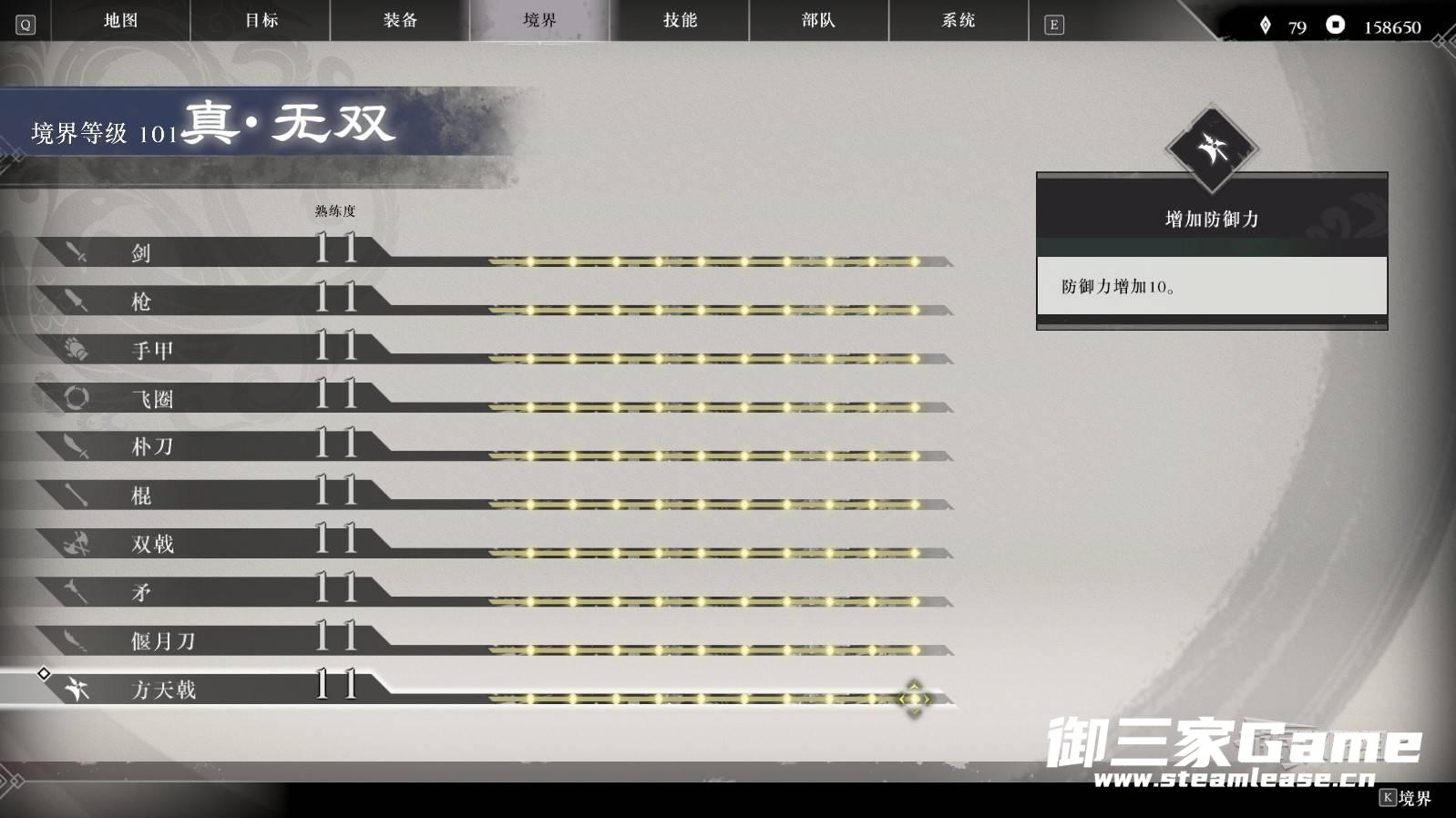 通关后,境界等级上限也会提升,可以使用未使用过的武器来提高熟练度,在境界等级65时会解锁新境界【真无双】。