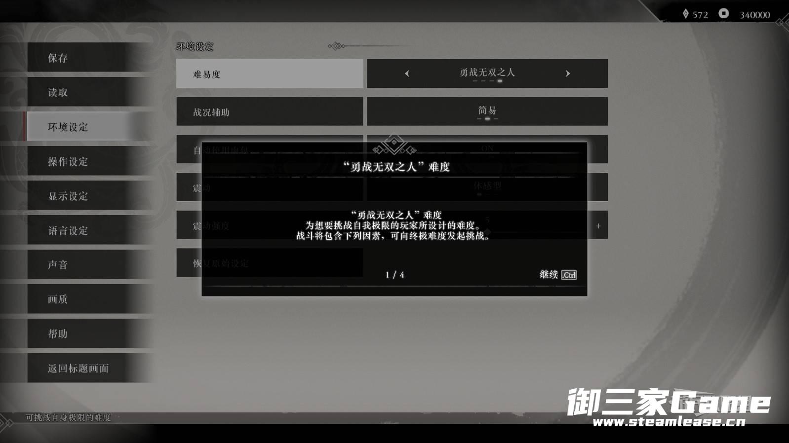 通关任意路线后读取通关存档,即可在暂停菜单的【环境设定】中更改为新的【勇战无双之人】难度。
