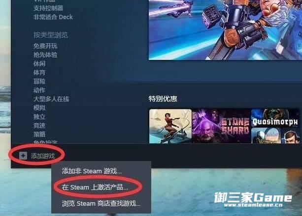 购买的Steam平台游戏key,可到Steam平台左下角的“添加游戏”处激活。