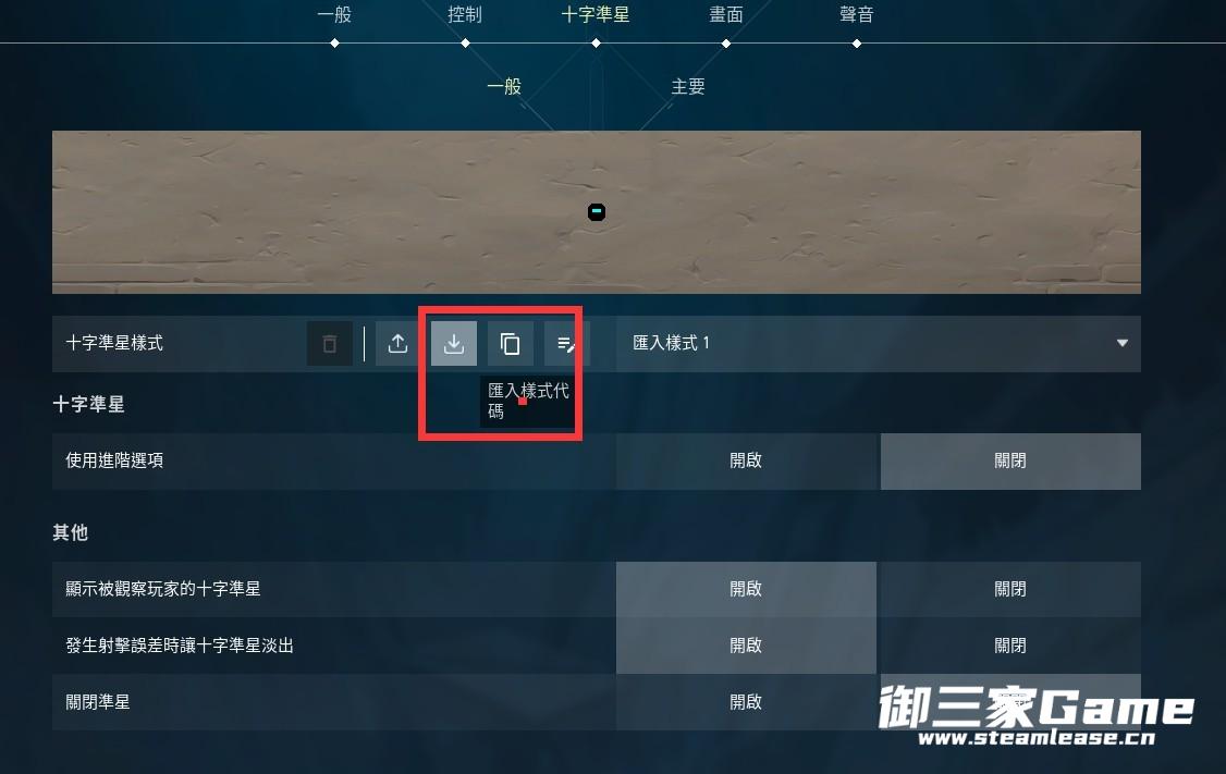 点击【设定】-【十字准星】、【汇入样式代码(下图红框所示)】,然后粘贴代码即可。