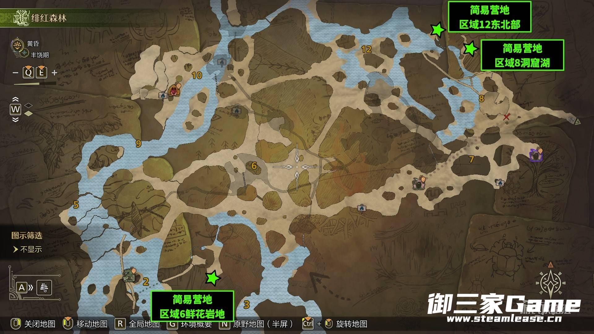 提前在绯红森林的区域6、区域8、区域12分别搭建简易营地。