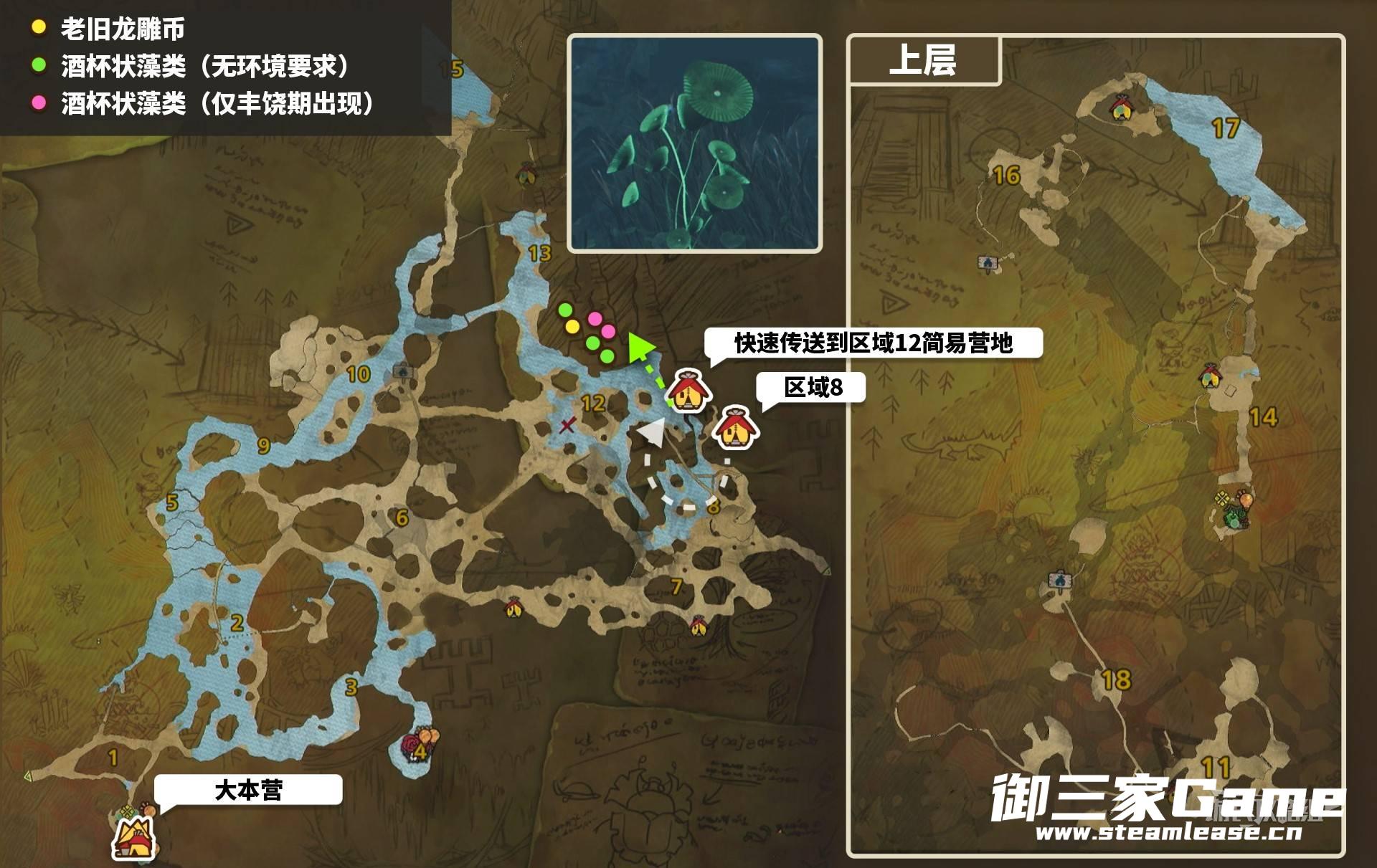 收集完所有的老旧龙雕币和酒杯藻后,返回区域8,在营地休息,此时地图上的老旧龙雕币和酒杯藻就都会刷新了,回到步骤2重复整个流程,直到集齐所需数量。