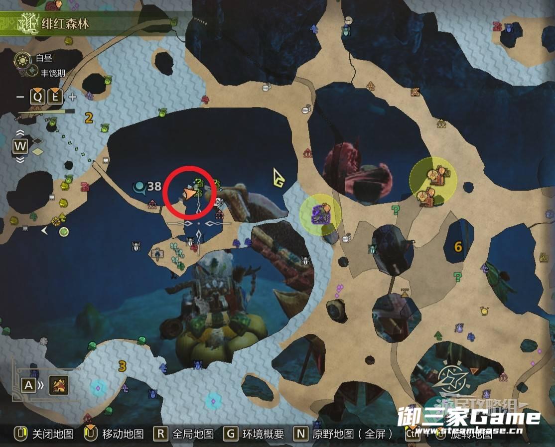 位置在【绯红森林】区域2和6之间连接的小路上,第六区临时营地附近,具体位置可以参考下图。