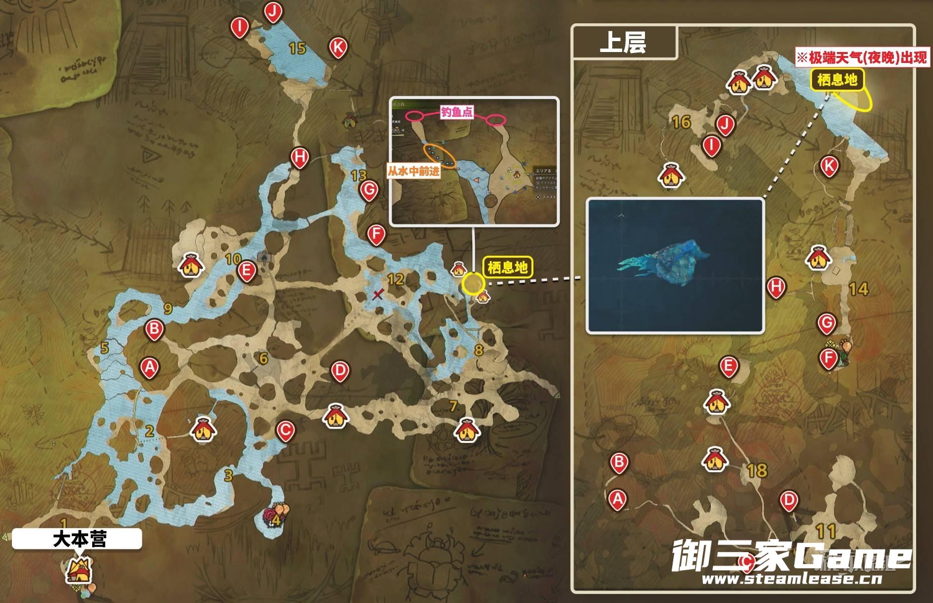 建议前往绯红森林区域8附近的钓点,提前在附近搭建简易营地【区域8洞窟湖】,然后在营地休息将时期变更为【丰饶期】。如果没有看到瑰丽盾章菊螺就传送到其他地图,再快速传送回简易营地【区域8洞窟湖】,继续观察钓鱼点,重复之前的步骤直到看见瑰丽盾章菊螺。