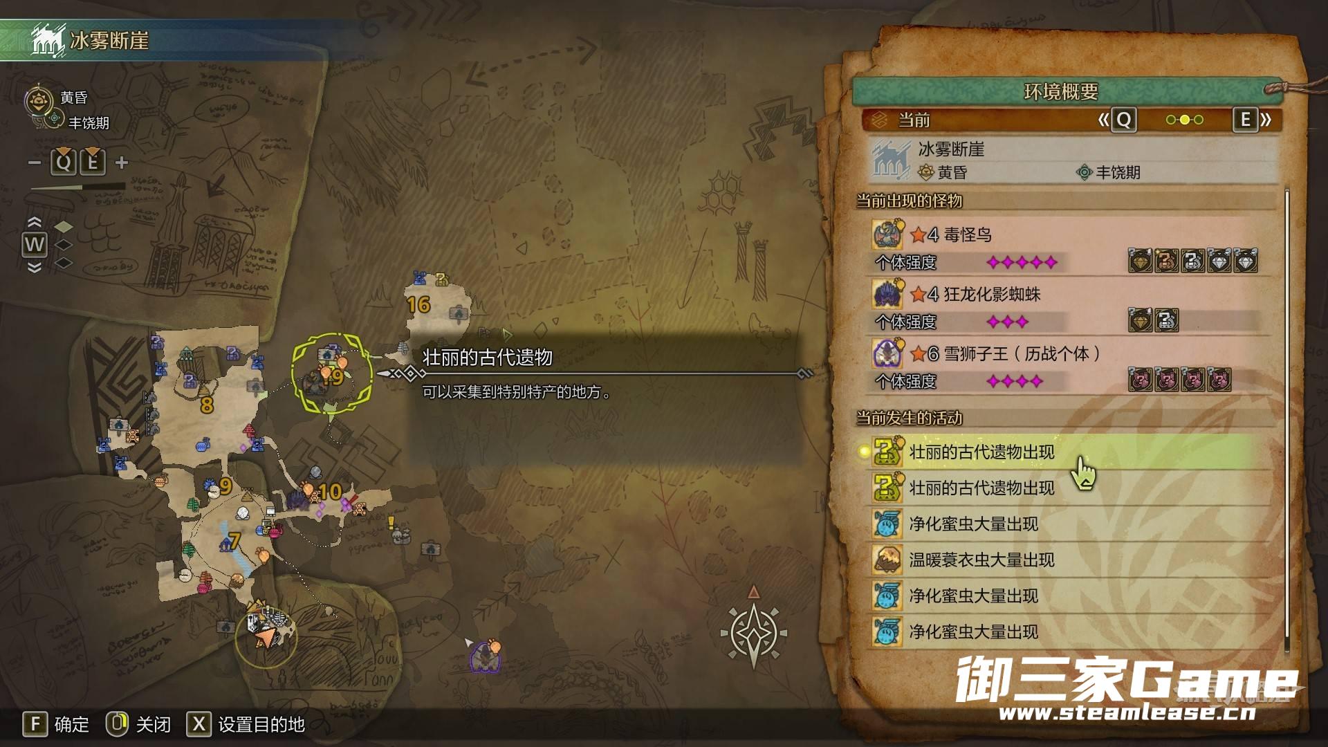 可以通过冰雾断崖环境概要中的【壮丽的古代遗物】出现事件来获得,通过【环境概要】可以查看发生的具体地点,设置目的地后骑乘鹭鹰龙自动寻路并前往即可。