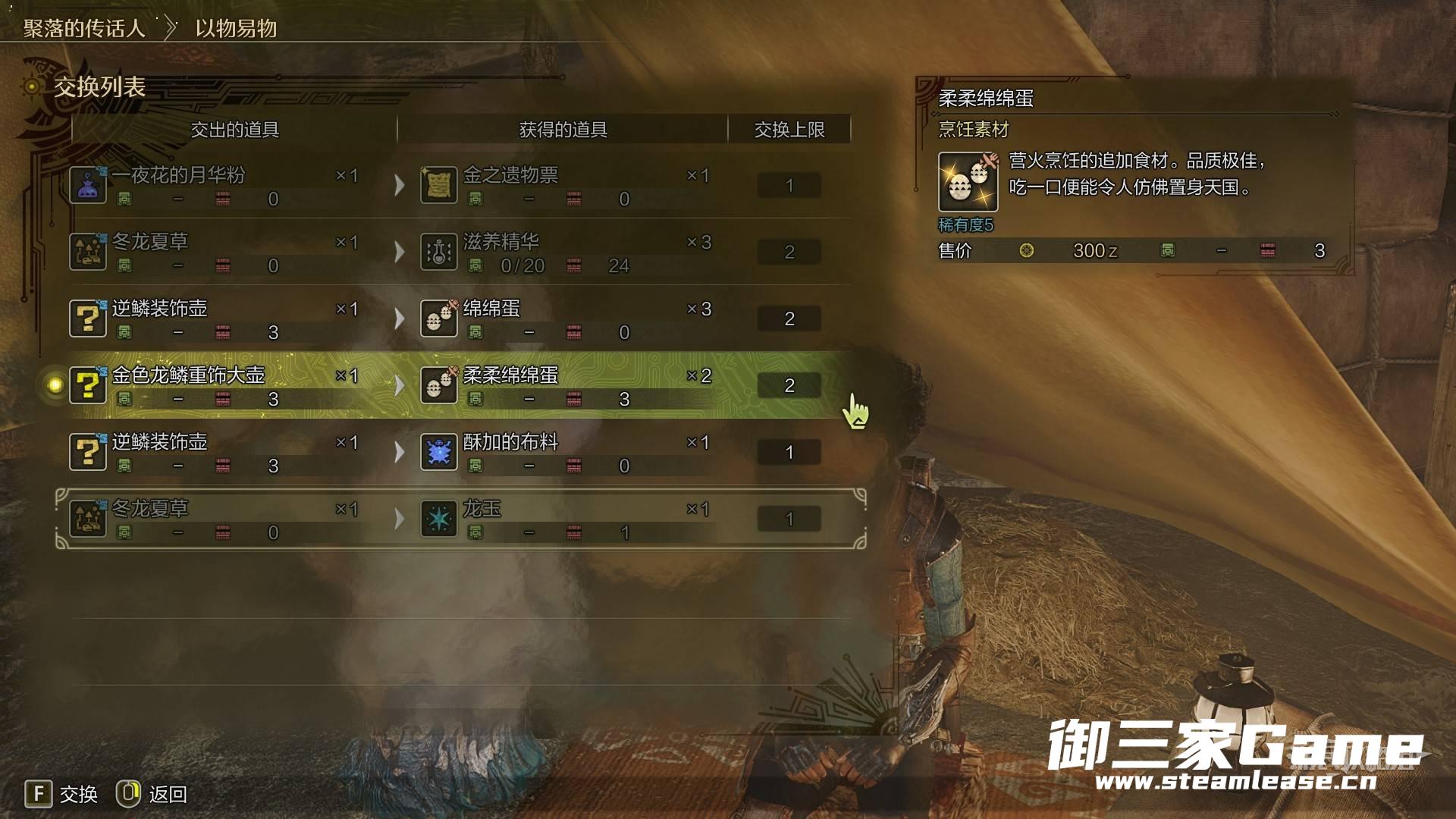 金色龙鳞重饰大壶可以用来与【交汇之峰酥加】的【雪华】交换特殊防具素材或稀有食材,与雪华对话一次后,即可在个人营地中与纳塔对话直接进行以物易物,无需再传送到交汇之峰酥加来进行。注意以物易物的可换道具在每次休息后都会随机更换。