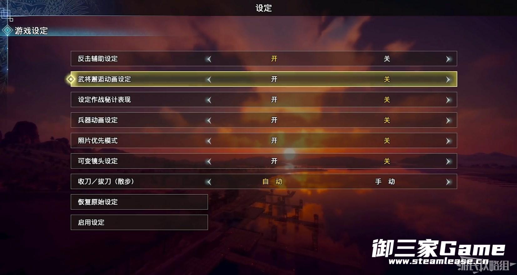 在主菜单选择「设定」,然后打开「游戏设定」,在「武将邂逅动画设定」一项中选择「关」即可关闭遇到无双武将时触发的登场动画。