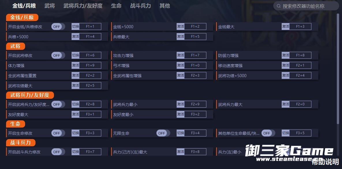 1.开启金钱/兵粮修改:政略指令界面修改。