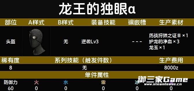 《怪物猎人荒野》中龙王的独眼α只有头盔的部分,带有逆袭3技能,没有技能珠孔位。下面为大家带来《怪物猎人荒野》龙王的独眼α装备图鉴,希望对大家有用。