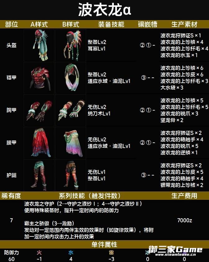 《怪物猎人荒野》中的波衣龙α套装自带整备5与无伤5,拥有两个三级孔。下面为大家带来《怪物猎人荒野》波衣龙α套装图鉴,一起来看看吧。