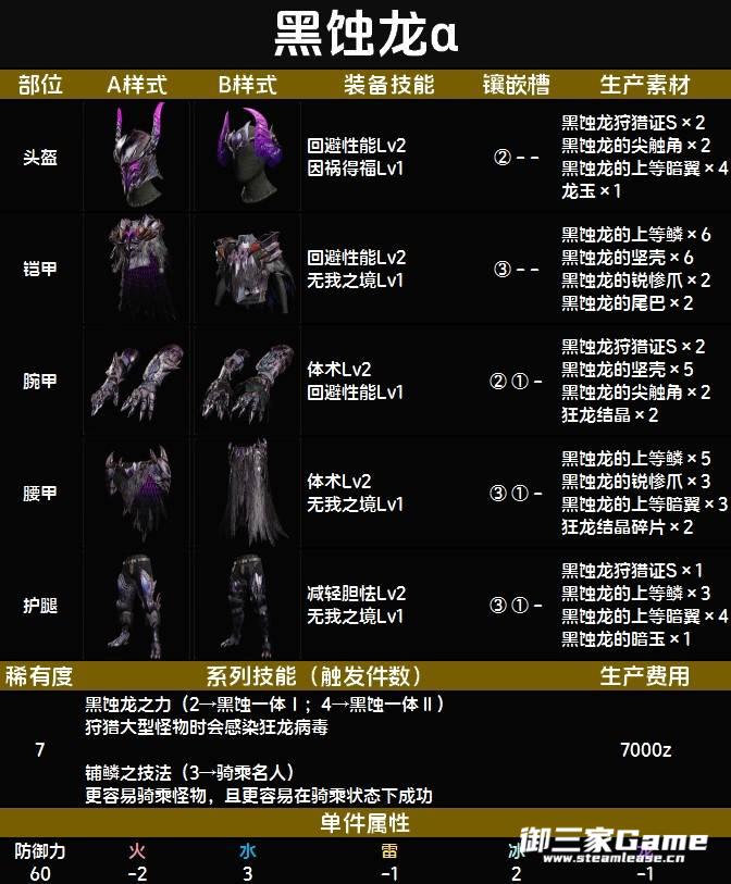 《怪物猎人荒野》中的黑蚀龙α套装自带回避5,还有三个三级孔。下面为大家带来《怪物猎人荒野》黑蚀龙α套装图鉴,一起来看看吧。