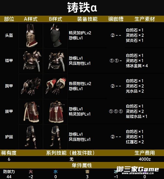 《怪物猎人荒野》的铸铁α装备是一套R6的防具,技能多并且孔位也不少,包含三个二级孔。下面为大家带来《怪物猎人荒野》铸铁α套装图鉴,希望对大家有用。
