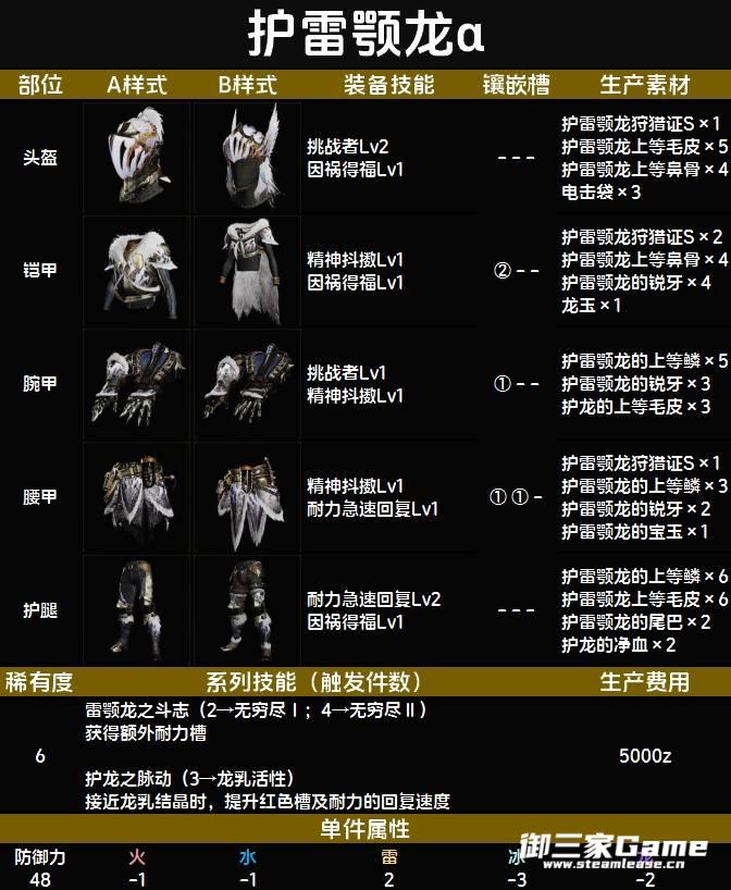 《怪物猎人荒野》中的护雷颚龙α套装是一套R6防具,每件防具都有两个技能,并且套装还包含一个二级孔。下面为大家带来《怪物猎人荒野》护雷颚龙α套装图鉴,希望对大家有用。