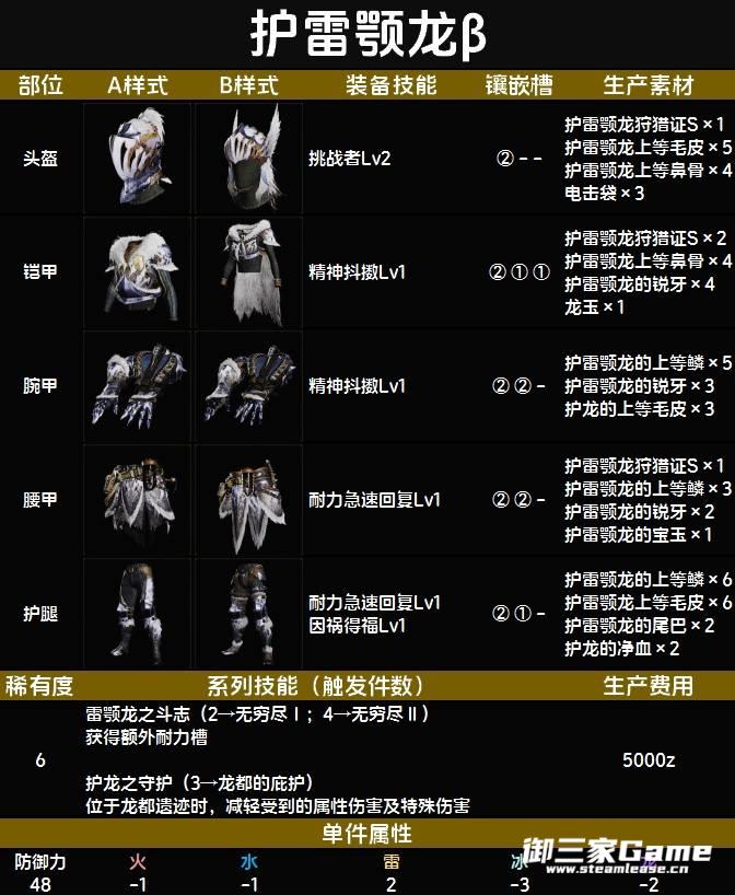 《怪物猎人荒野》中的护雷颚龙β套装作为R6品级的防具拥有更多的二级孔,可以选用更多的珠子。下面为大家带来《怪物猎人荒野》护雷颚龙β套装图鉴,希望对大家有用。