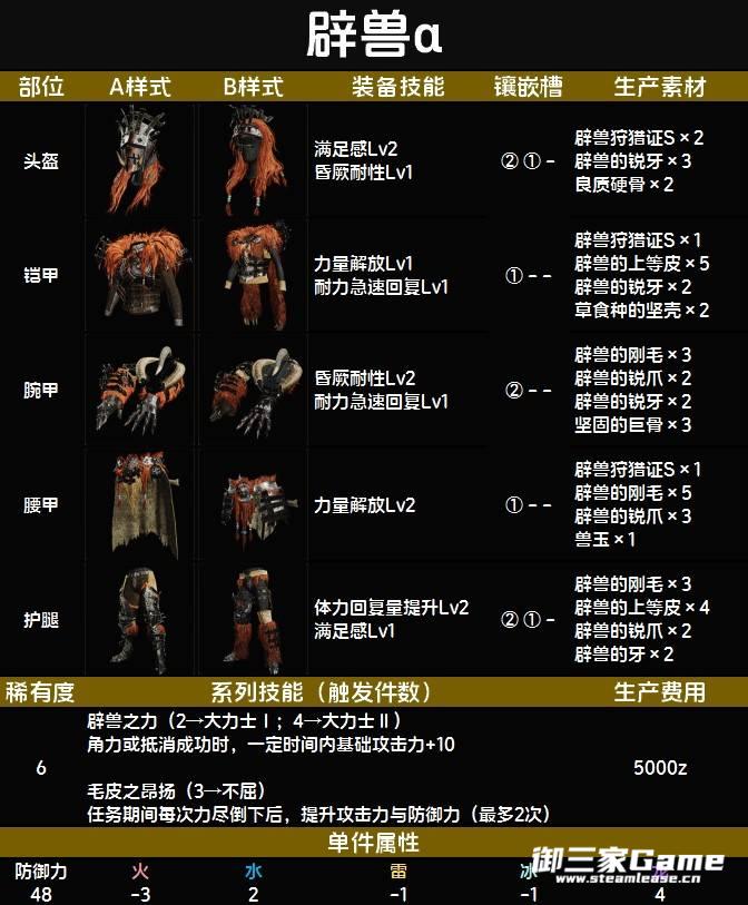 《怪物猎人荒野》中的辟兽α套装是一套R6防具,包含三个二级孔和四个一级孔。下面为大家带来《怪物猎人荒野》辟兽α套装图鉴,一起来看看吧。