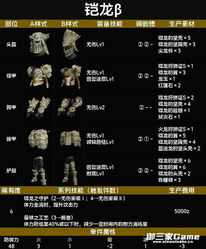 《怪物猎人荒野》的铠龙β套装也自带无伤5,只是耐震技能有所减少,但是拥有更多的二级孔。下面为大家带来《怪物猎人荒野》铠龙β套装图鉴,希望对大家有用。