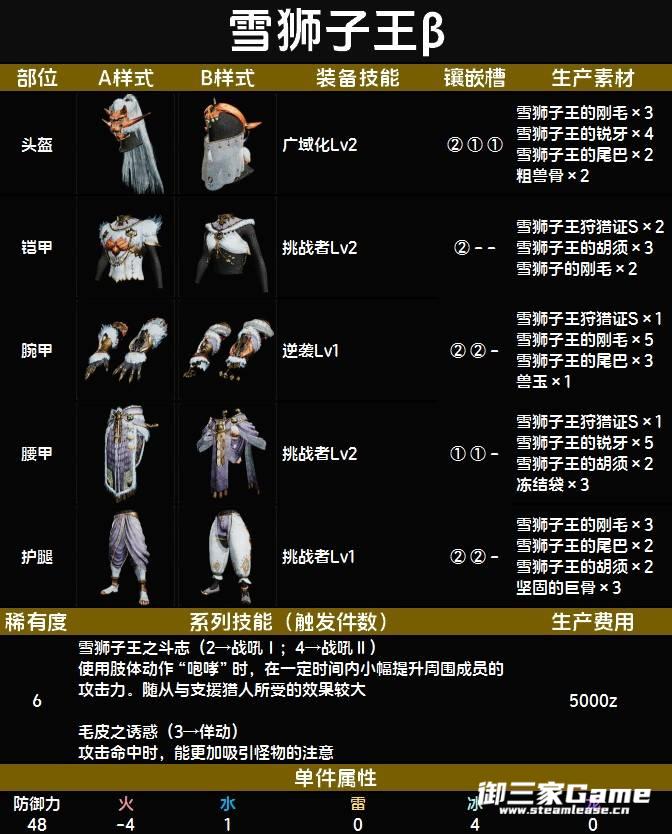 《怪物猎人荒野》的雪狮子王β套装拥有很多的孔位,但是装备自带技能的等级比α套低一些。下面为大家带来《怪物猎人荒野》雪狮子王β套装图鉴,希望对大家有用。
