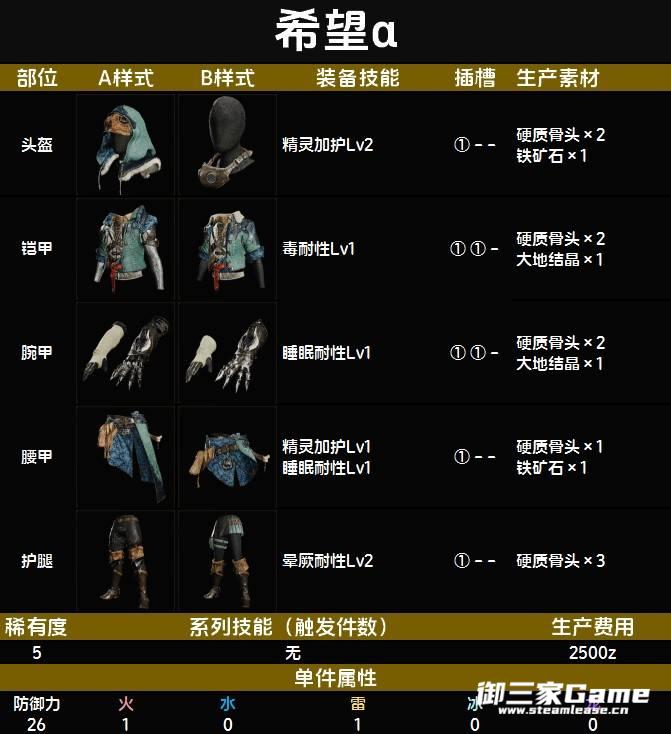 《怪物猎人荒野》希望α套装是一套上位防具,相比下位有着更好的数据和技能,并且还带有插槽。下面为大家带来《怪物猎人荒野》希望α套装图鉴,一起来看看吧。