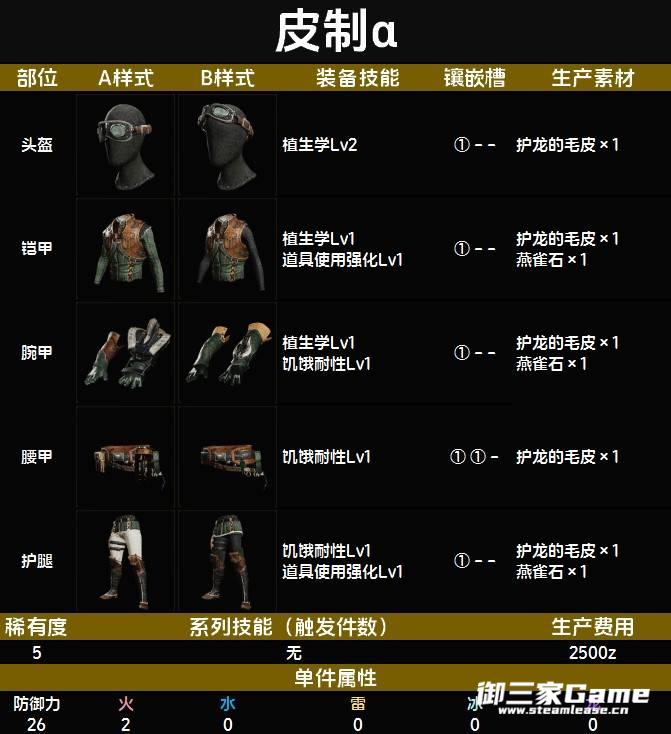 《怪物猎人荒野》中的皮制α套装是上位初期就能解锁制作的装备,性能比下位版更加优秀。下面为大家带来《怪物猎人荒野》皮制α套装图鉴,希望对大家有用。