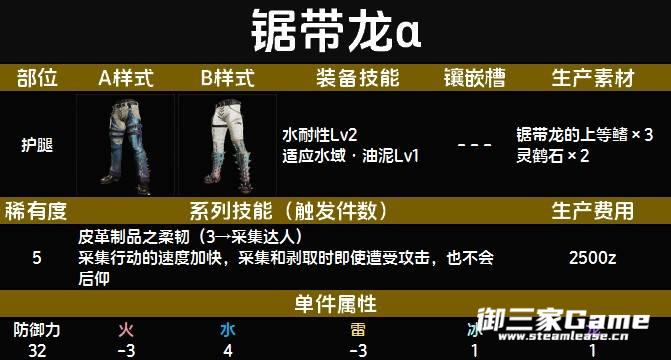 《怪物猎人荒野》中的锯带龙α装备只有护腿部分,,拥有两个技能,没有插槽。下面为大家带来《怪物猎人荒野》锯带龙α装备图鉴,希望对大家有用。