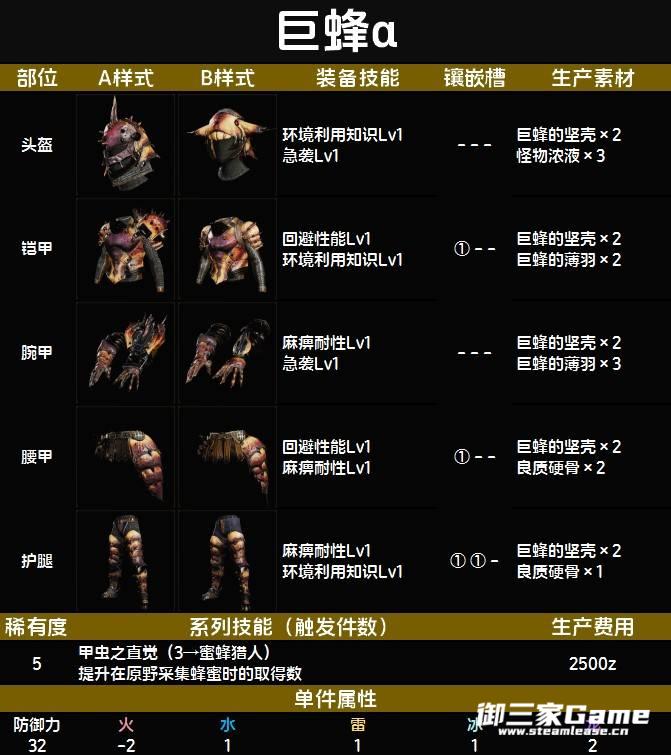 《怪物猎人荒野》巨蜂α套装是一套稀有度R5的防具,每件装备都有2个技能,但是插槽少一些。下面为大家带来《怪物猎人荒野》巨蜂α套装图鉴,希望对大家有用。