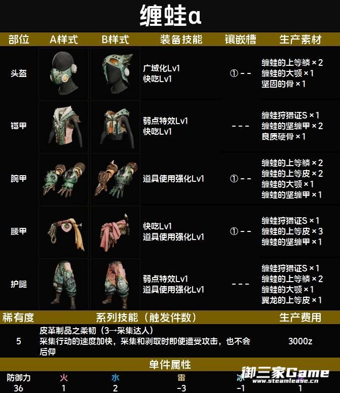 《怪物猎人荒野》缠蛙α套装是一套R5的防具,虽然空位较少,但是装备技能较多。下面为大家带来《怪物猎人荒野》缠蛙α套装图鉴,希望对大家有用。