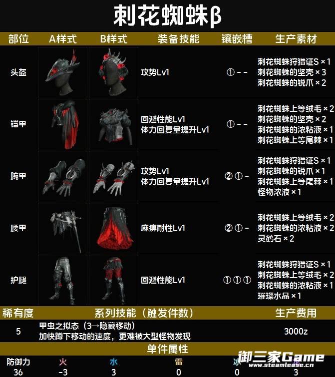 《怪物猎人荒野》中的刺花蜘蛛β套装有着很多的技能空位,有两个2级孔。下面为大家带来《怪物猎人荒野》刺花蜘蛛β套装图鉴,希望对大家有用。