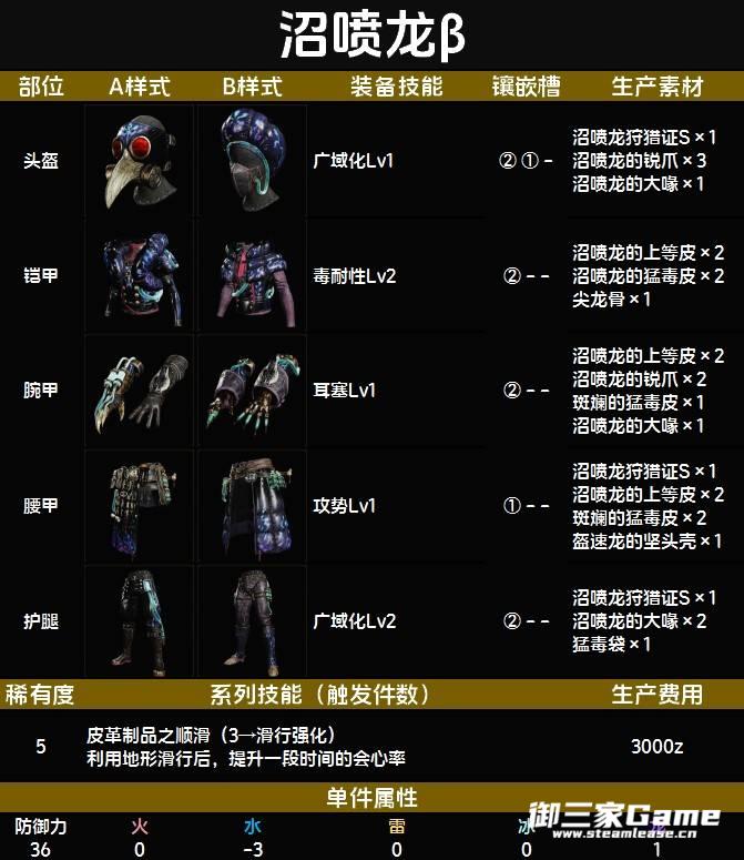 《怪物猎人荒野》中的沼喷龙β套装虽然技能没有α套装多,但是却有着四个二级孔。下面为大家带来《怪物猎人荒野》沼喷龙β套装图鉴,希望对大家有用。