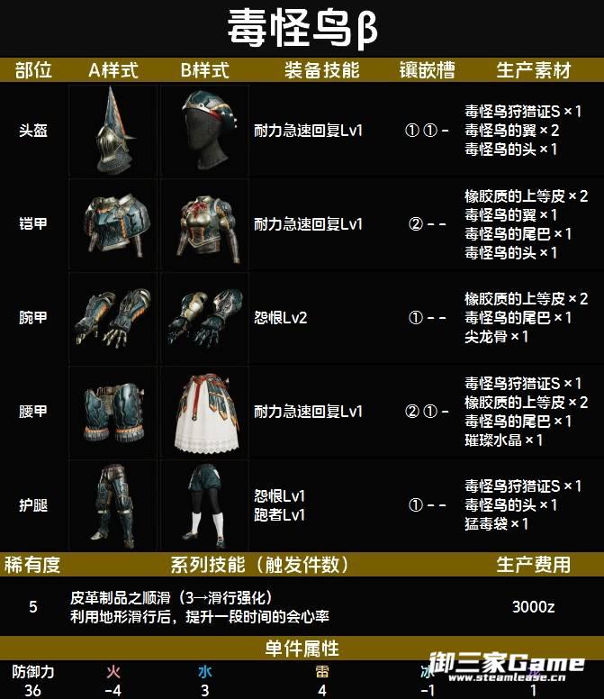 《怪物猎人荒野》的毒怪鸟β套装拥有较多的孔位,只是相比α套装来说,装备技能少了些。下面为大家带来《怪物猎人荒野》毒怪鸟β套装图鉴,希望对大家有用。