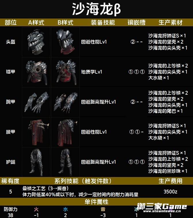 《怪物猎人荒野》中的沙海龙β套装技能较少,但是技能珠空位较多,且拥有两个2级孔。下面为大家带来《怪物猎人荒野》沙海龙β套装图鉴,希望对大家有用。