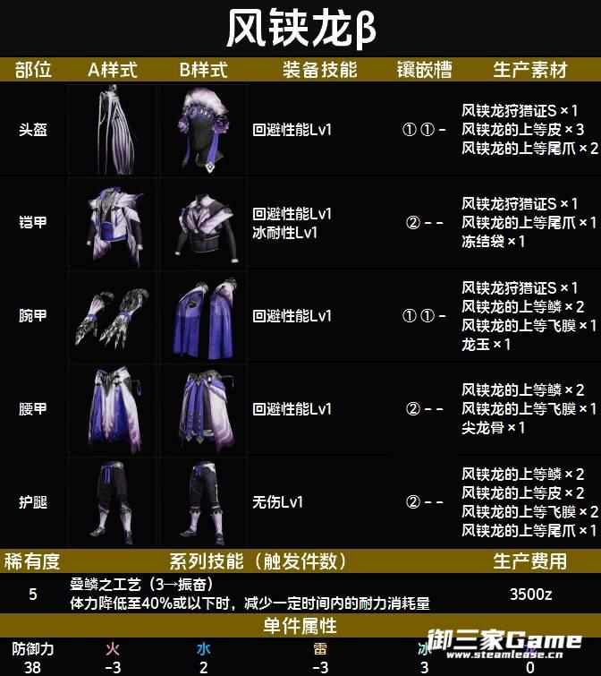 《怪物猎人荒野》中的风铗龙β套装是一套稀有度R5的防具,技能比α版本少,但是孔位较多。下面为大家带来《怪物猎人荒野》风铗龙β套装图鉴,一起来看看吧。