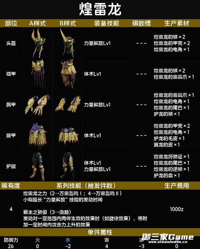 煌雷龙是《怪物猎人荒野》的原创怪之一,很多玩家也都在测试中体验了这只怪的任务。下面为大家带来《怪物猎人荒野》下位煌雷龙套装图鉴,希望对大家有用。
