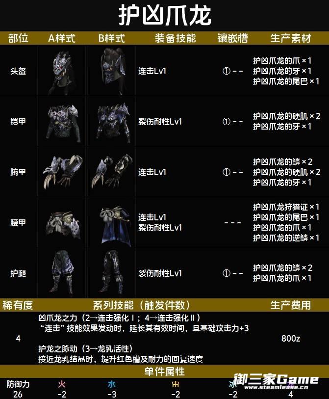 《怪物猎人荒野》的护凶爪龙也是一只造龙种怪物,其下位防具是一套稀有度4的装备。下面为大家带来《怪物猎人荒野》下位护凶爪龙套装图鉴,希望对大家有用。