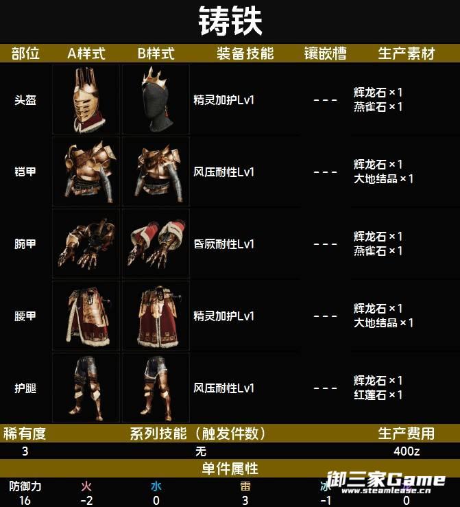 《怪物猎人荒野》下位铸铁套装的稀有度为三星,那么铸铁套拥有什么技能,需要哪些制作材料呢?下面为大家带来《怪物猎人荒野》下位铸铁套装图鉴,希望对大家有用。